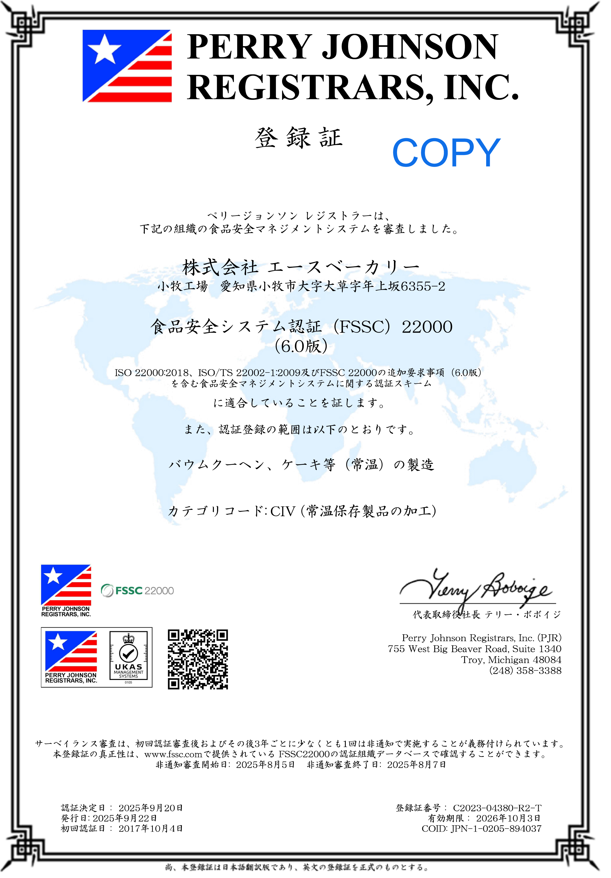 エースベーカリーは、品質マネジメントシステムの国際規格ISO9001:2015、